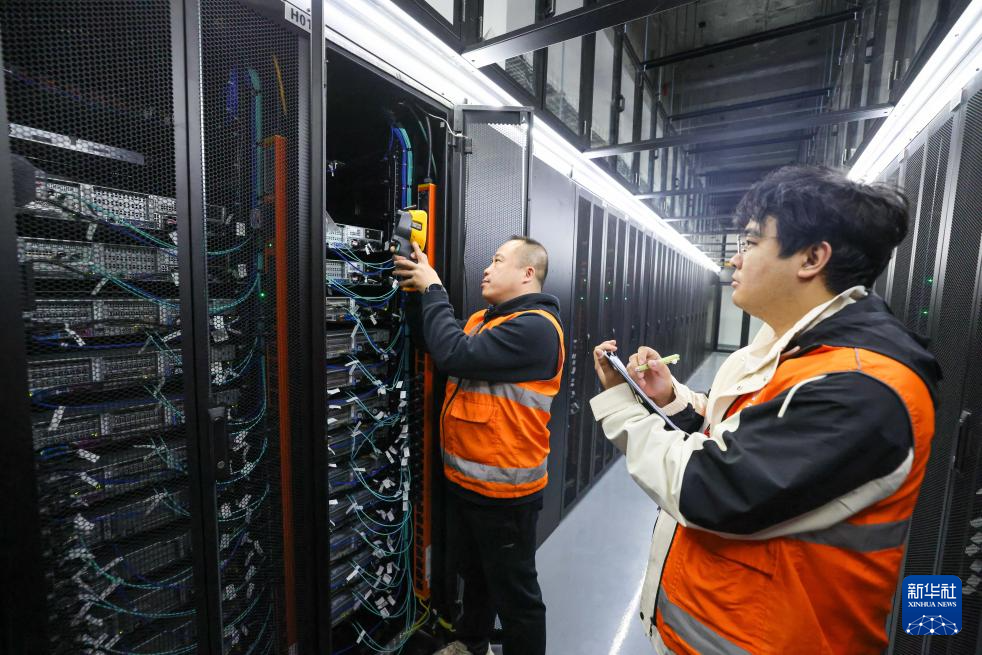 2月26日,在位于京津产业新城高村数智创新园的中国联通京津冀数字科技产业园,运维工程师对服务器设施测温记录。