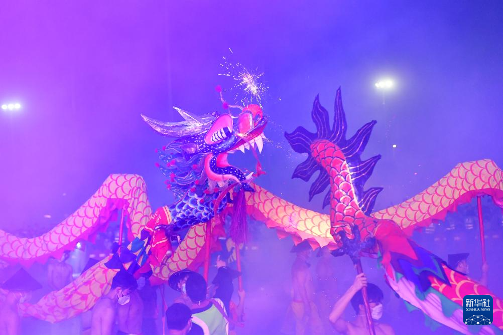 2月27日,在广西宾阳县炮龙文化广场,人们在炮龙节上舞炮龙。