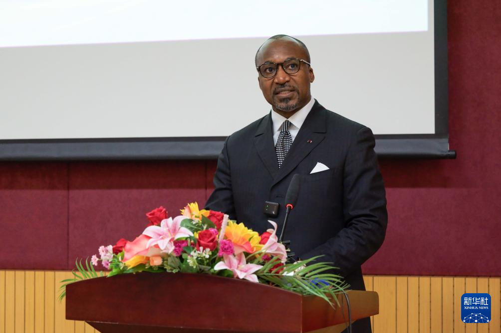 2月26日,刚果(布)国际合作部长德尼·克里斯特尔·萨苏-恩格索在布拉柴维尔举行的“零关税·新机遇”中刚商贸洽谈会暨签约仪式上致辞。