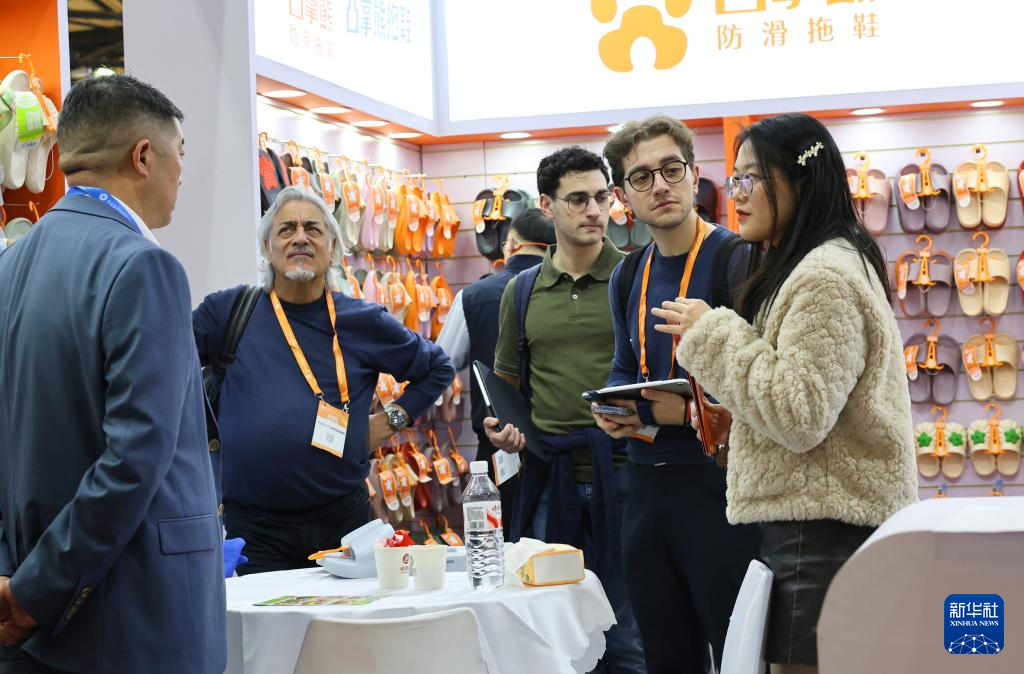 3月1日,展商工作人员(右一)向采购商介绍产品信息。