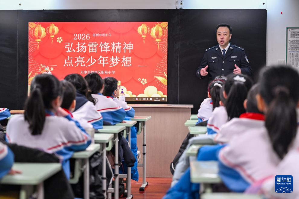 3月2日,在天津市和平区新星小学,民警在宣讲雷锋精神。