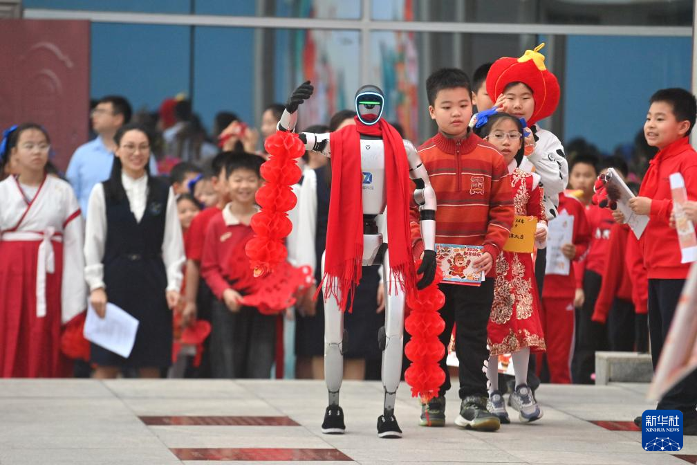 3月2日,在广西南宁市滨湖路小学,人形机器人和孩子们在开学典礼上送上马年祝福。