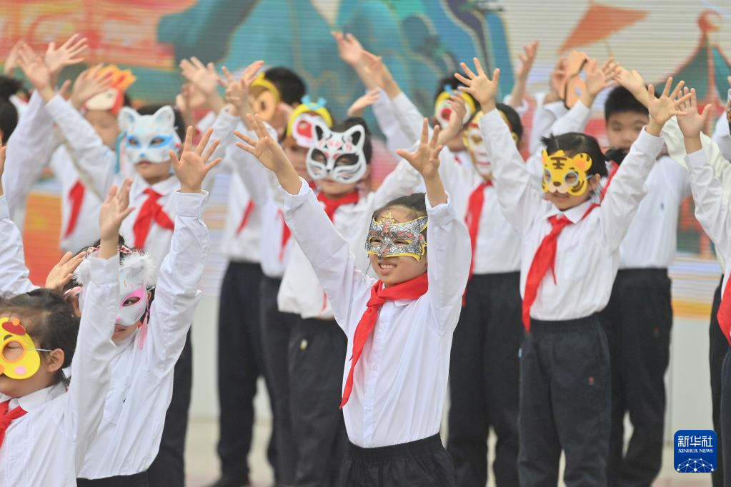 3月2日,在广西南宁市滨湖路小学,孩子们在开学典礼上进行情景表演。