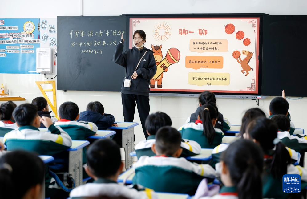 3月2日,宁夏银川市兴庆区实验第二小学的学生在听老师讲开学第一课。