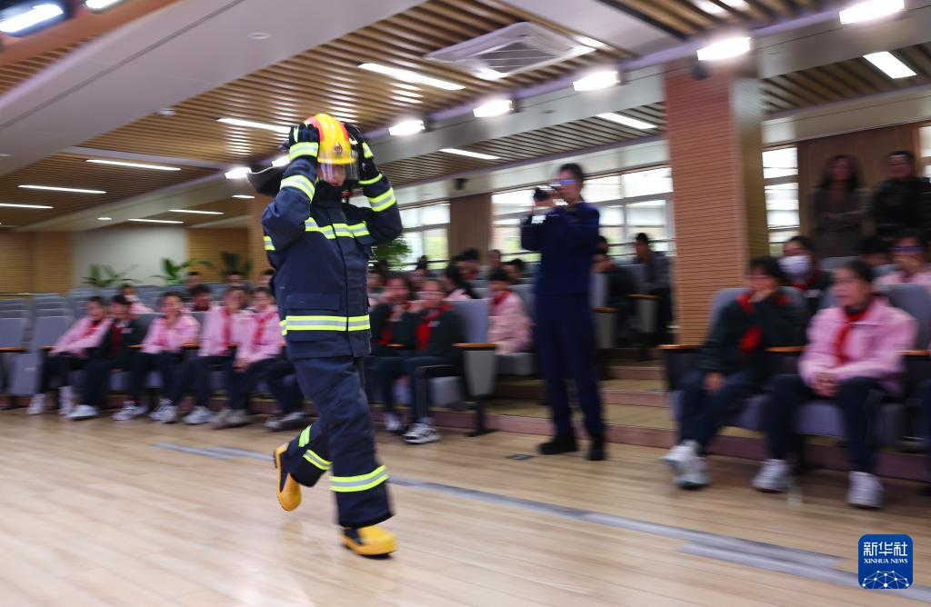 3月2日,上海市长宁区消防救援局为上海市天山初级中学学生带来一堂消防安全实训课。这是消防员在课堂上与学生进行拨打119火警电话的情景演示。