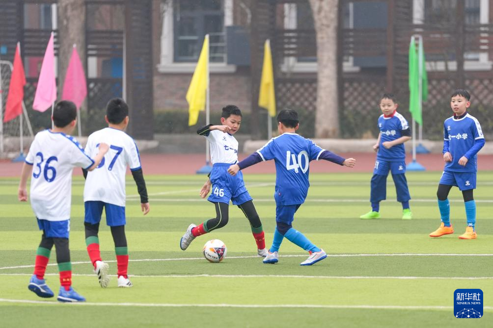 3月2日,北京市海淀区七一小学学生在“浪花杯”班级足球联赛中拼抢。