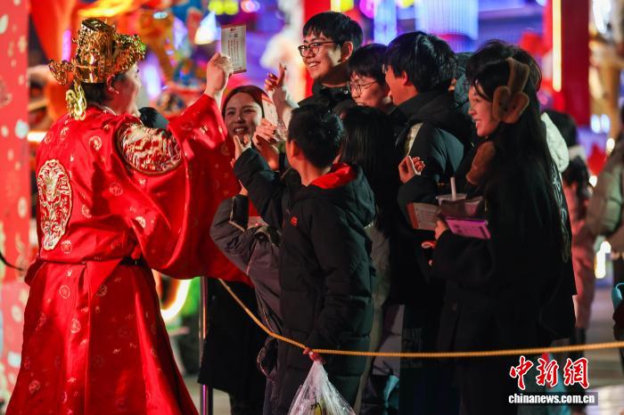 3月2日,武汉欢乐谷张灯结彩迎元宵。市民与游客在园区里赏花灯、品民俗、尝美食,观看“飞天鳌鱼”、打铁花、花车巡游等活动,迎接元宵佳节的到来。图为工作人员装扮的“财神”与游客互动。中新社记者 张畅 摄