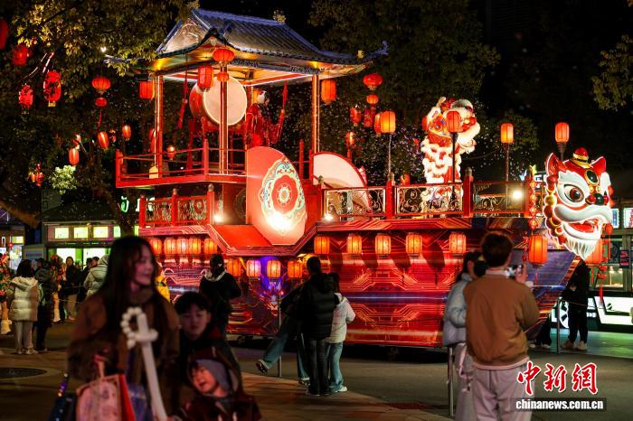 3月2日,武汉欢乐谷张灯结彩迎元宵。市民与游客在园区里赏花灯、品民俗、尝美食,观看“飞天鳌鱼”、打铁花、花车巡游等活动,迎接元宵佳节的到来。图为游客观赏花车巡游。中新社记者 张畅 摄