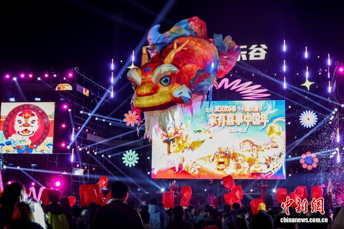 3月2日,武汉欢乐谷张灯结彩迎元宵。市民与游客在园区里赏花灯、品民俗、尝美食,观看“飞天鳌鱼”、打铁花、花车巡游等活动,迎接元宵佳节的到来。图为“飞天鳌鱼”表演吸引游客观看。中新社记者 张畅 摄