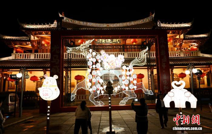 3月2日晚,福建泉州鲤城区花巷的巨型花灯建筑吸引游客参观。元宵将至,彩扎灯、针刺灯、刻纸灯、料丝灯等逾2000盏花灯将泉州古城装点得流光溢彩、美不胜收。中新社记者 吕明 摄