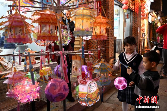 3月2日晚,福建泉州古城区的手工花灯吸引小朋友。元宵将至,彩扎灯、针刺灯、刻纸灯、料丝灯等逾2000盏花灯将泉州古城装点得流光溢彩、美不胜收。中新社记者 吕明 摄