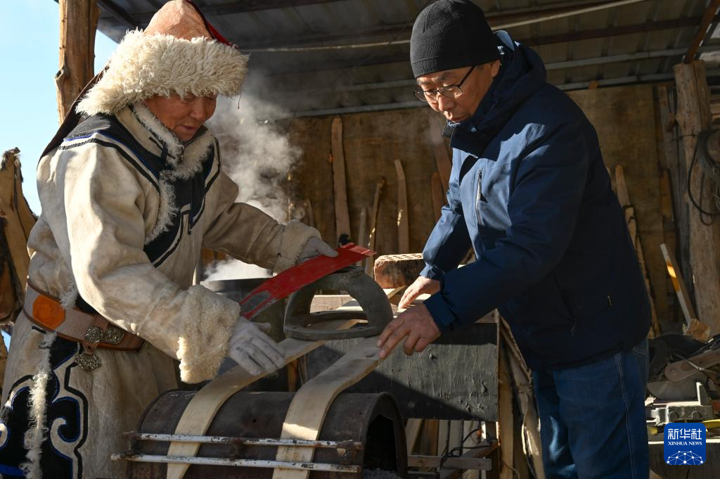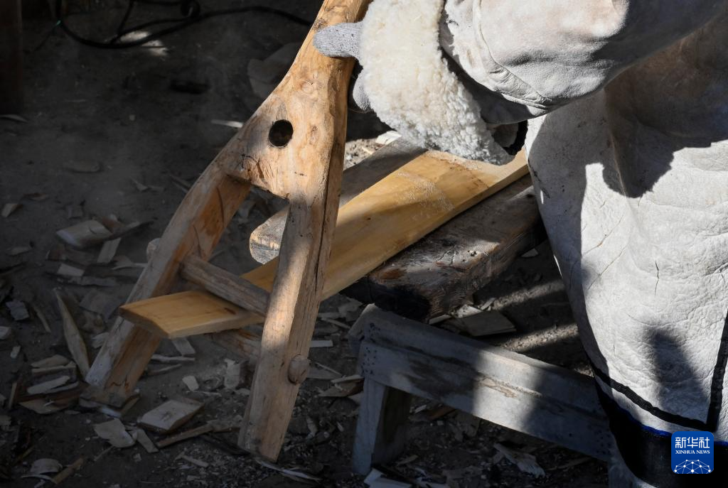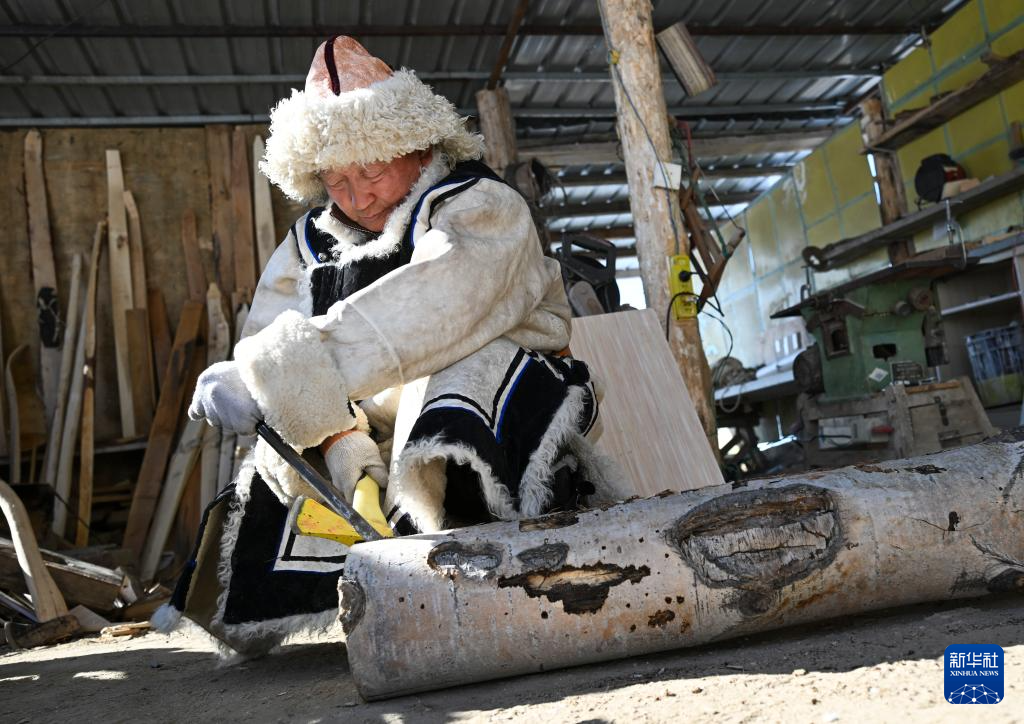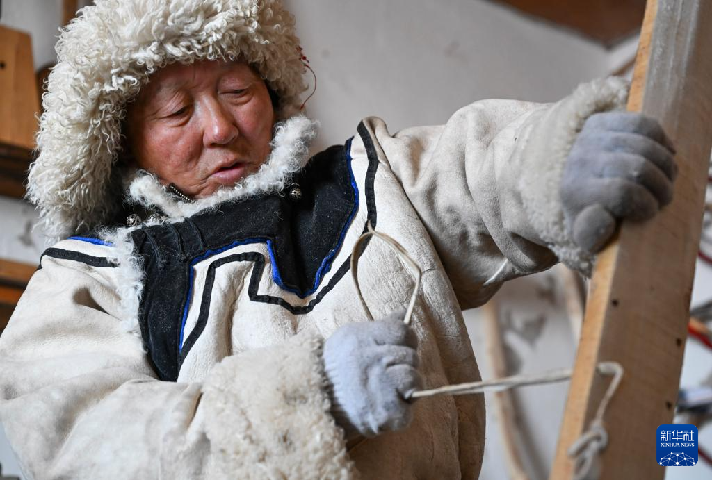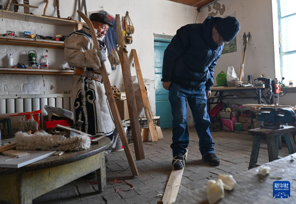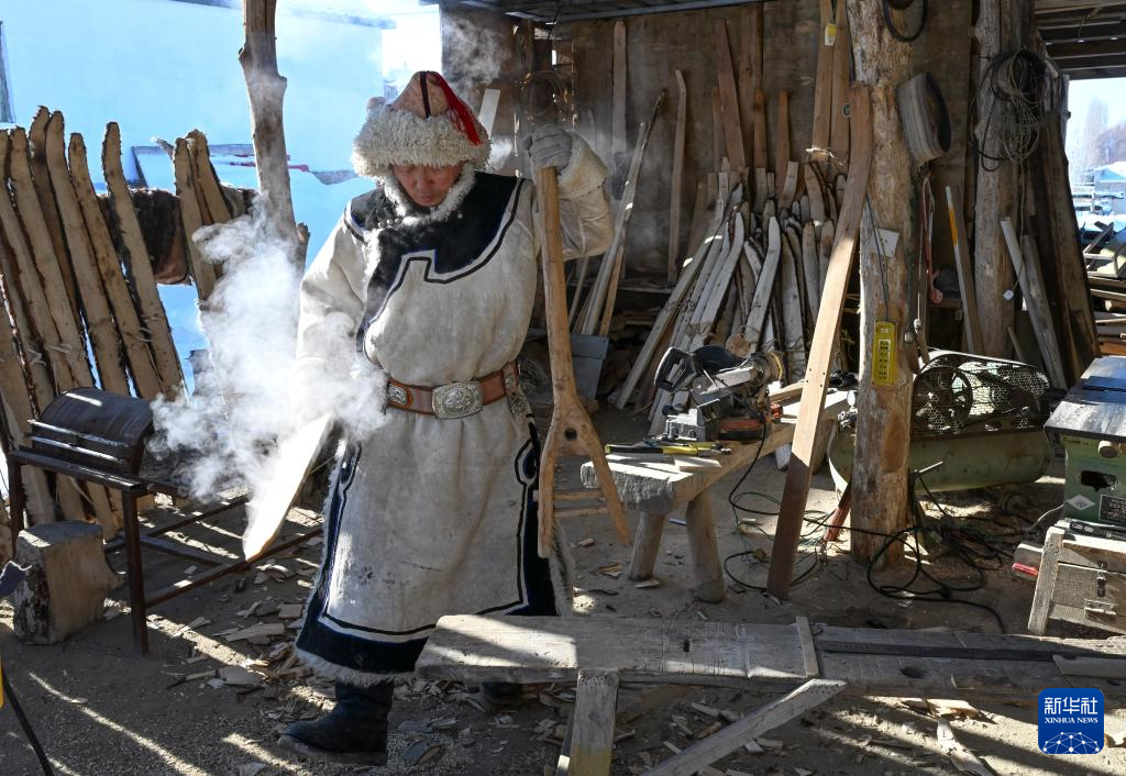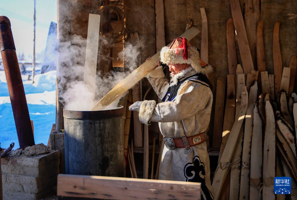 时下的阿勒泰,莽莽雪原银装素裹,最低气温仍低于零下二十摄氏度。在新疆阿勒泰市汗德尕特蒙古族乡汗德尕特村,非遗匠人铁木尔加甫·卡汗别力克挥斧刨木、鞣皮绑绳,一副副承载古老智慧的毛皮滑雪板在手中成型。