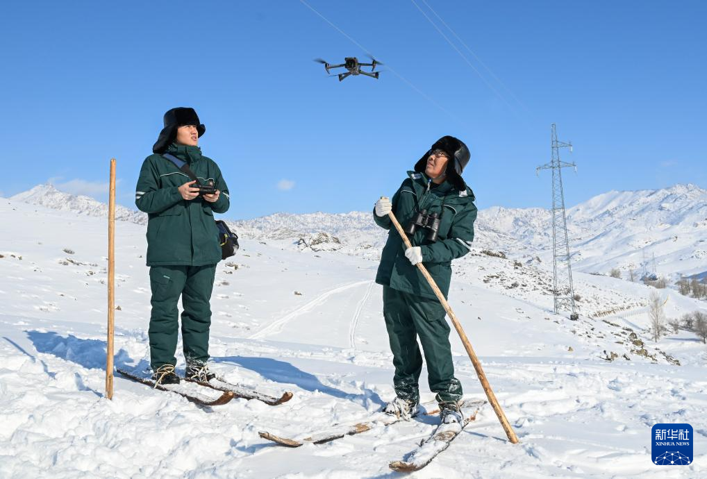在新疆阿勒泰市汗德尕特蒙古族乡汗德尕特村,巴图别勒克·吾齐克(右)和徒弟叶思哈提·努尔兰穿着毛皮滑雪板在山上巡线,叶思哈提在操控无人机进行进一步巡查(2月24日摄)。