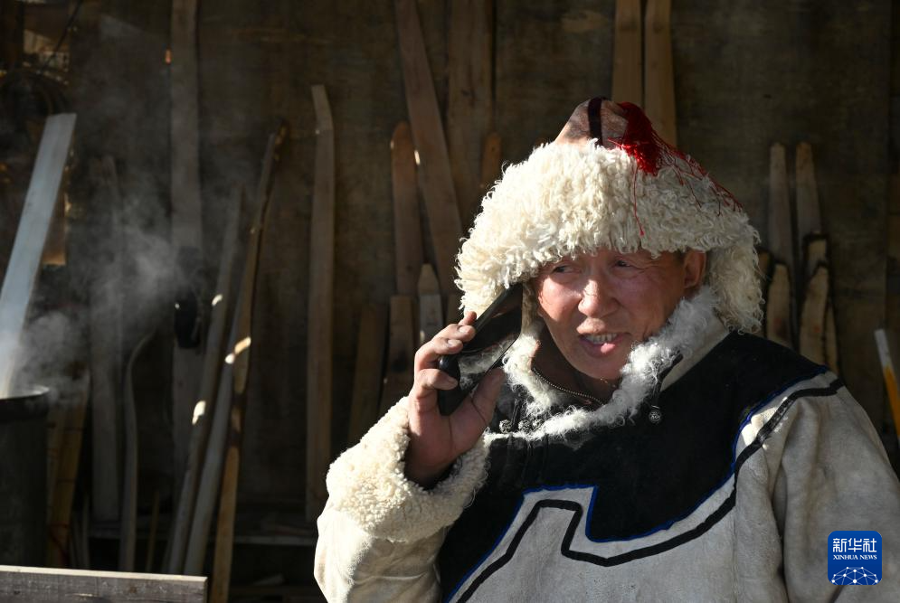 在新疆阿勒泰市汗德尕特蒙古族乡汗德尕特村,铁木尔加甫·卡汗别力克接到一家文旅公司的电话,对接毛皮滑雪板定做事宜(2月25日摄)。