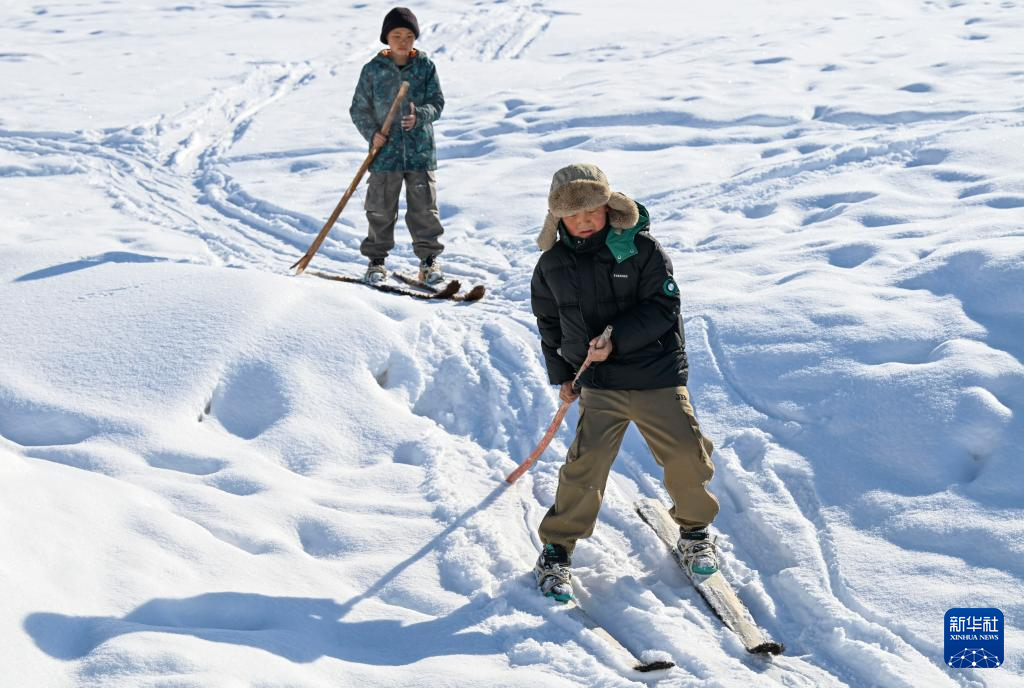 在新疆阿勒泰市汗德尕特蒙古族乡汗德尕特村,两名小朋友穿着毛皮滑雪板在滑雪(2月25摄)。