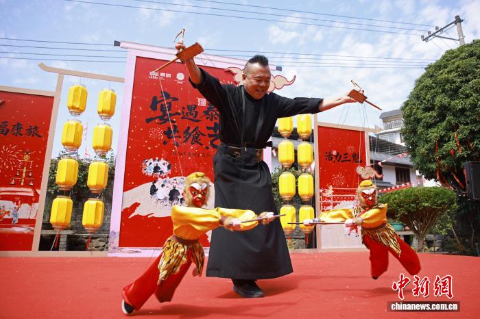 3月3日,表演者在“百家宴”活动现场展示木偶戏。中新社记者 孙杨洋 摄