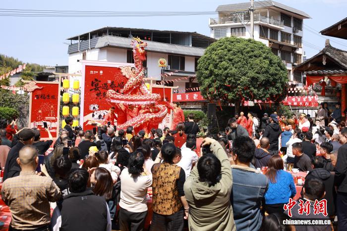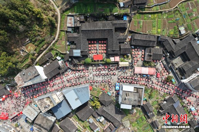 3月3日,“百家宴”活动开席现场。元宵节当日,浙江温州泰顺举办“百家宴”活动,“百家宴”拥有800多年历史,源自三魁镇张宅村的张氏“祠堂酒”,后发展为全民参与的“百家宴”,成为当地元宵节的独特标志。活动现场还有木偶戏、舞龙等民俗表演,让民众在品尝美食的同时,感受泰顺的乡土风情和民俗文化。(无人机照片)中新社记者 孙杨洋 摄