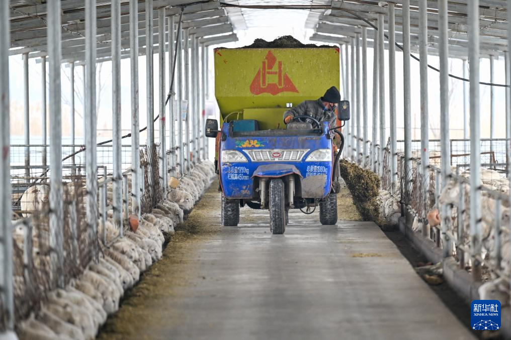 在位于新疆昌吉回族自治州的日发新西域玛纳斯牧业有限公司,工作人员驾驶自动撒料车喂羊(3月3日摄)。
