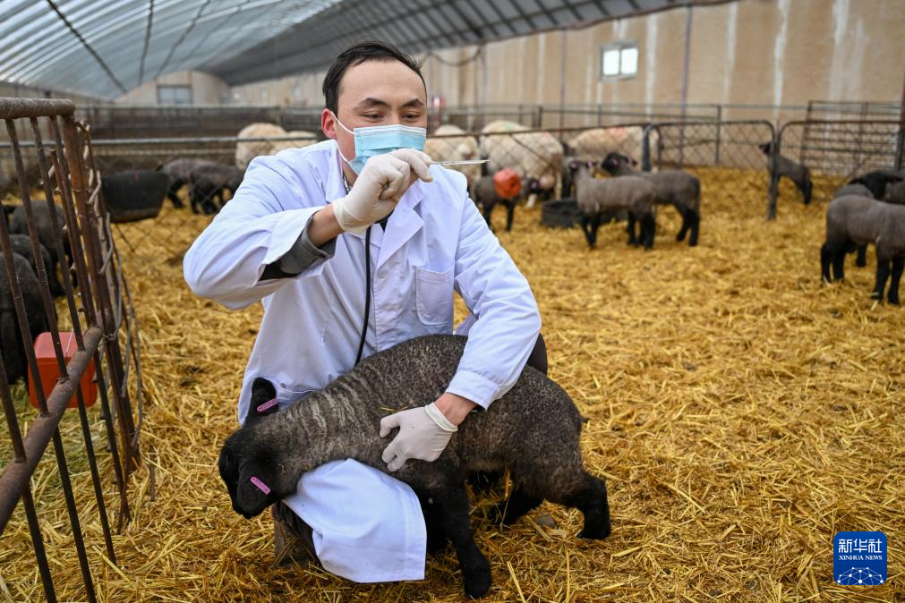在位于新疆昌吉回族自治州的日发新西域玛纳斯牧业有限公司,工作人员为羊羔测体温(3月3日摄)。