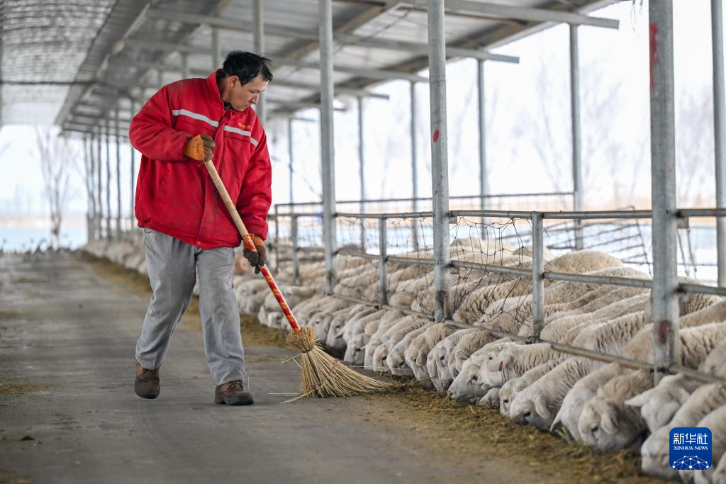 在位于新疆昌吉回族自治州的日发新西域玛纳斯牧业有限公司,工作人员打扫羊圈(3月3日摄)。