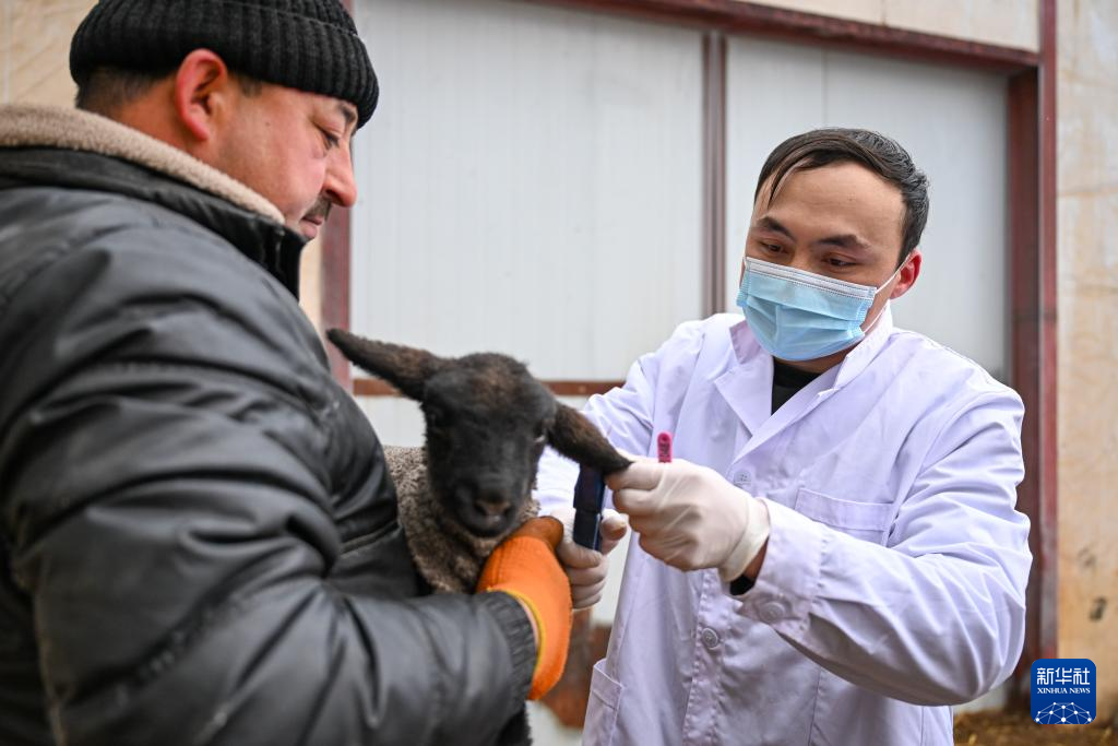 在位于新疆昌吉回族自治州的日发新西域玛纳斯牧业有限公司,工作人员为羊羔戴耳标(3月3日摄)。