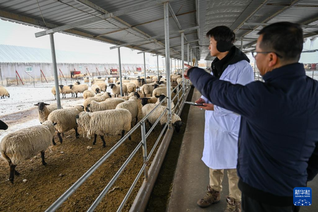 在位于新疆昌吉回族自治州的日发新西域玛纳斯牧业有限公司,饲养员观察羊羔状态(3月3日摄)。