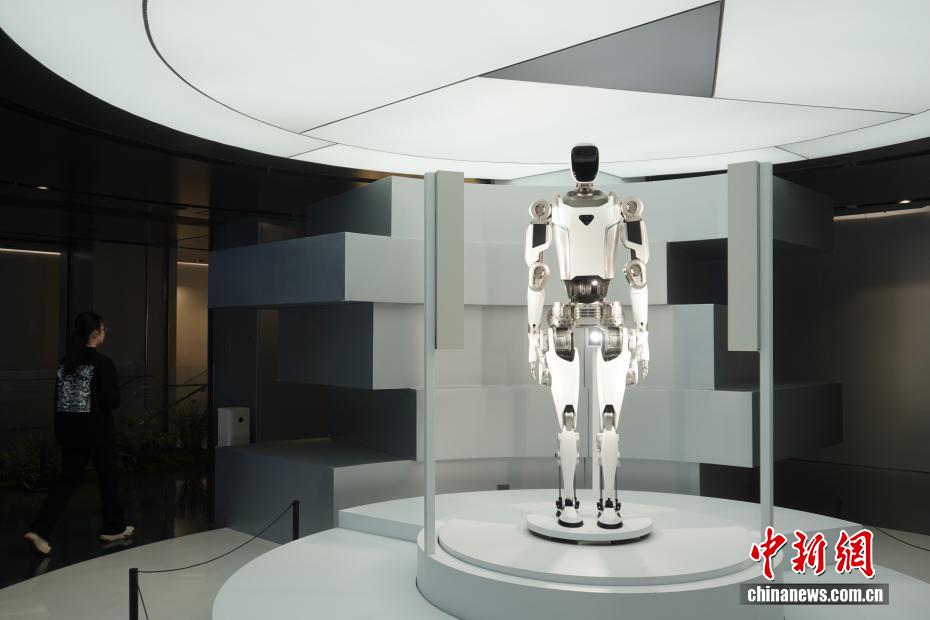 3月4日,河南郑州,中原异构人形机器人4S店吸引观众参观,这是河南首家人形机器人4S店。该店不仅展示与销售全球主流人形机器人产品,还提供租赁、专业维护保养以及基于场景的定制化解决方案,大大降低用户的使用门槛与风险。图为店内展出的人形机器人。