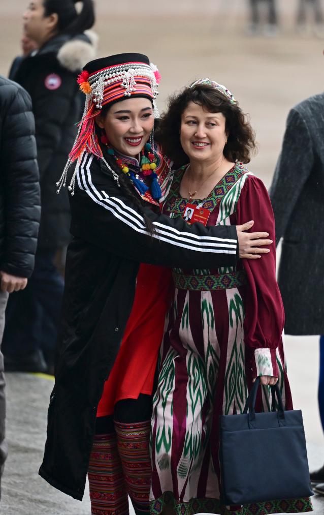 3月4日,中国人民政治协商会议第十四届全国委员会第四次会议在北京人民大会堂开幕。这是杨钰尼委员(左)与木合拜尔·阿布都尔委员一起步入会场。