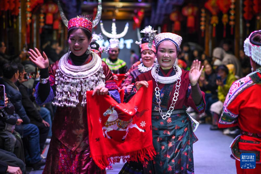 3月8日,绣娘在“村T”舞台展示民族服饰和刺绣。
