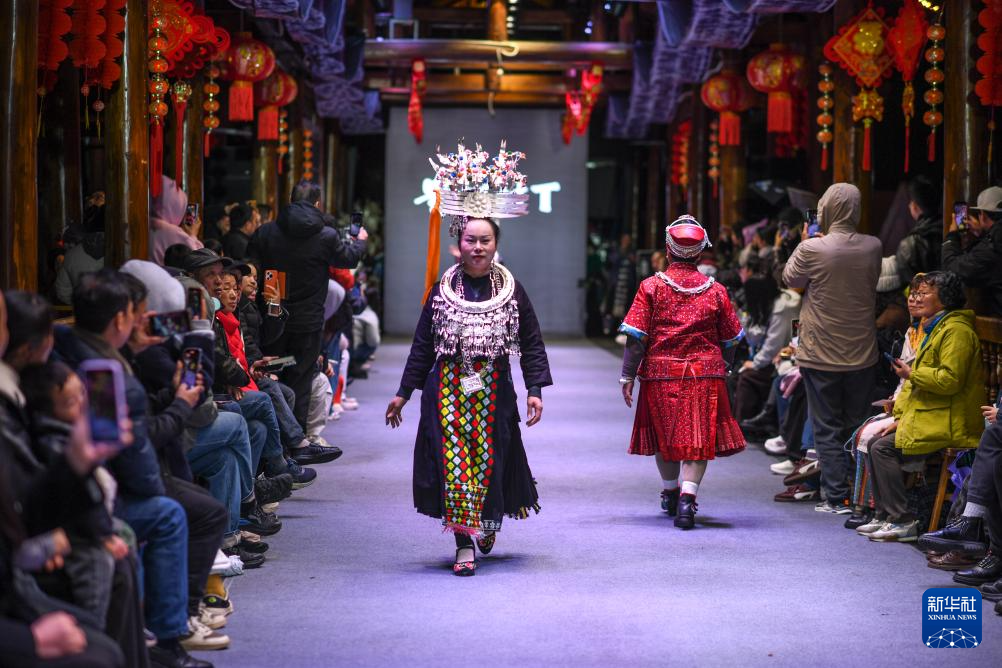 3月8日晚,一场“村T”民族服饰秀在贵州省凯里市苗侗风情园举行。来自黔东南苗族侗族自治州16个县市的绣娘、妇女代表走上T台,展示绚丽多彩的民族服饰之美。