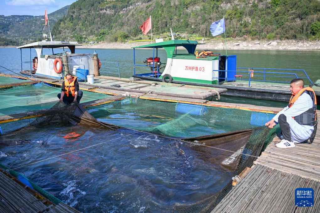 3月9日,重庆市万州区水产研究所大周基地工作人员在查看网箱内的鱼类生长情况。