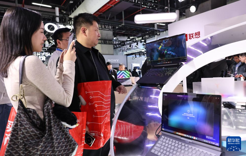 3月12日,参观者在东方枢纽展区现场一款屏幕可伸缩的笔记本电脑产品前驻足观看。