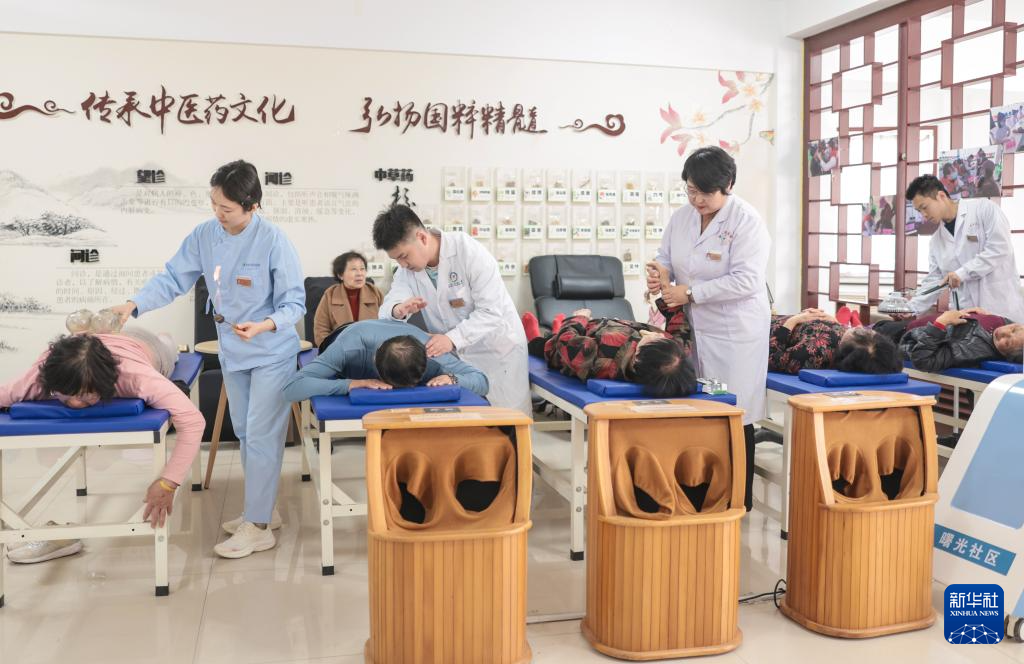 3月16日,在荣成市崖头街道曙光社区卫生室,来自市中医医院的医护人员为社区老人开展理疗服务。