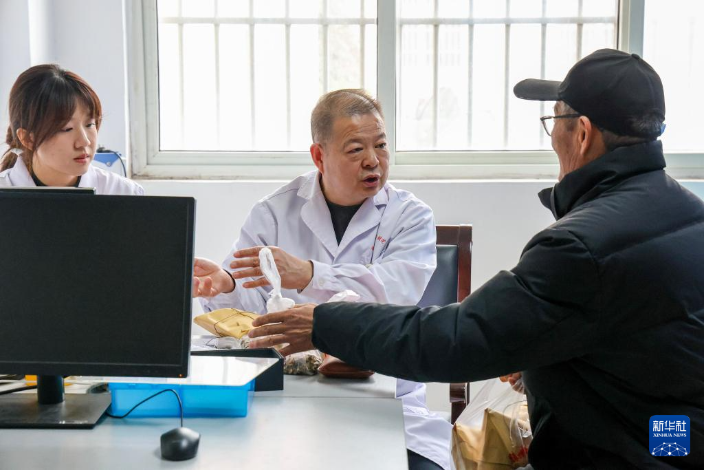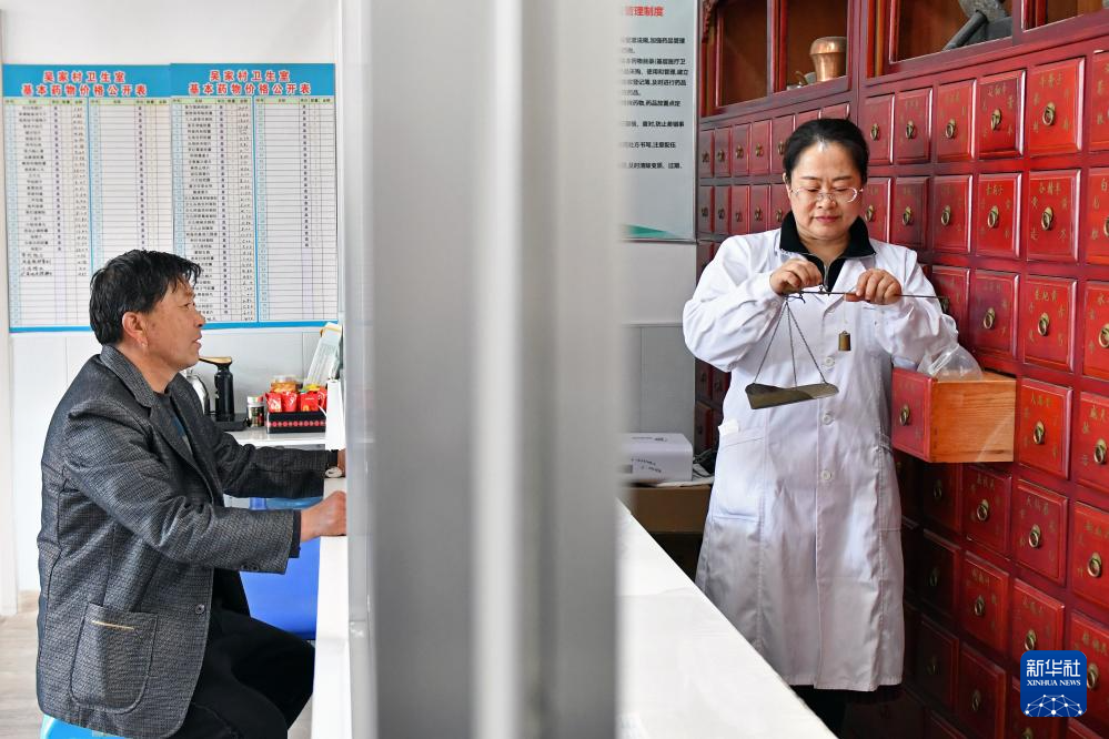 3月15日,在烟台市福山区臧家庄镇吴家村卫生室,医生为村民调配中药。