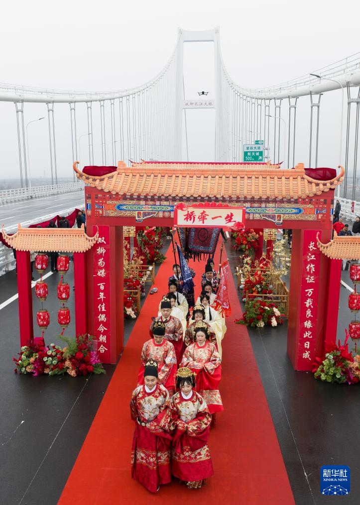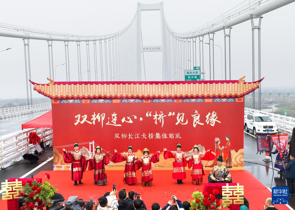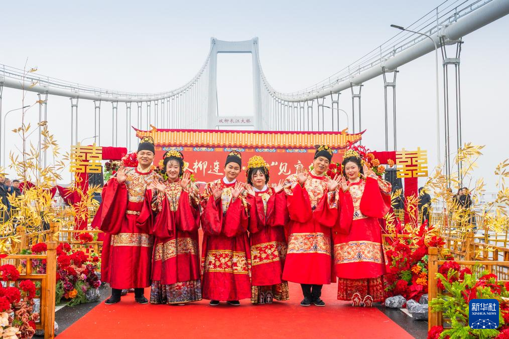 3月18日,一场集体婚礼在位于湖北武汉的双柳长江大桥建设工地举行。来自湖北交通投资集团等建设单位的三对新人,身着中国传统婚礼服饰,在亲友和同事的祝福声中,携手步入婚姻殿堂。