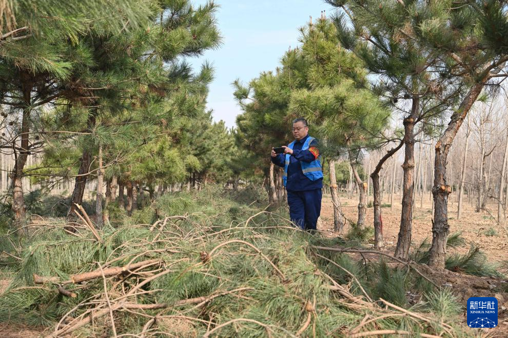 3月19日,刘世光在雄安新区“千年秀林”雄中片区的树林里查看病虫害情况。