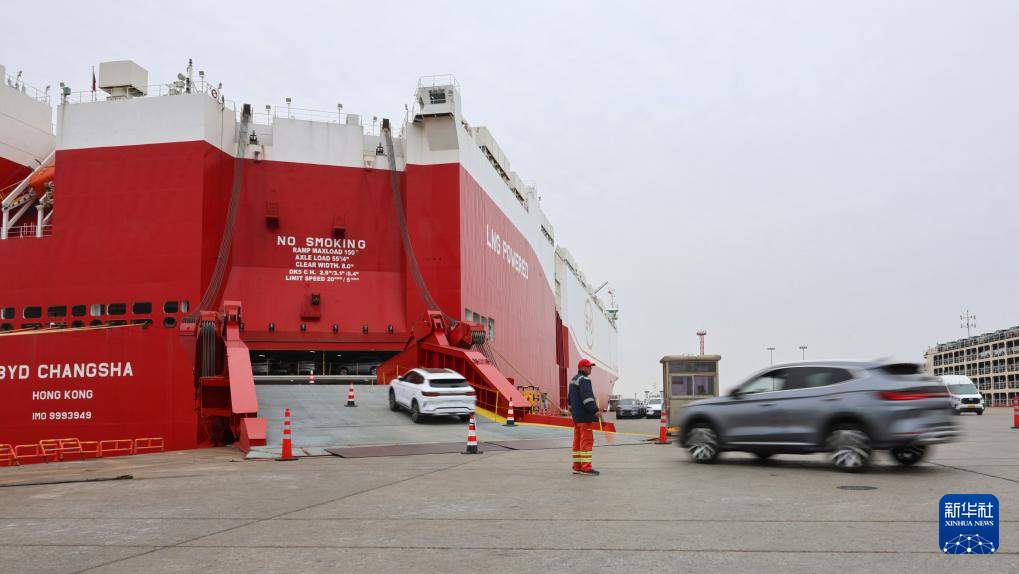 3月24日,工作人员在码头引导国产新能源汽车驶入汽车滚装船。