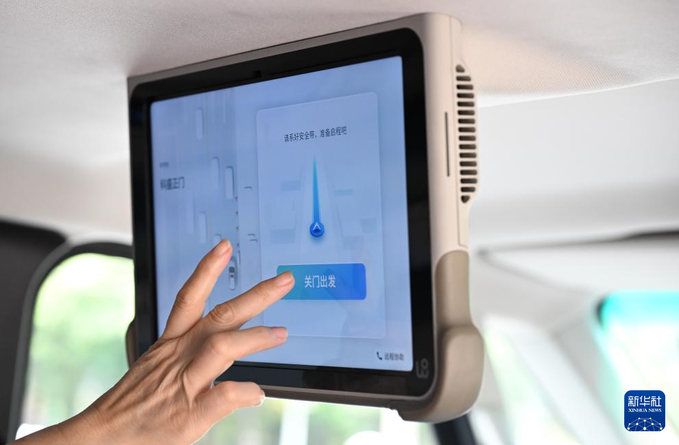 3月24日,在广州市海珠区螺旋大道,乘客在文远知行自动驾驶小巴点击屏幕启动汽车。
