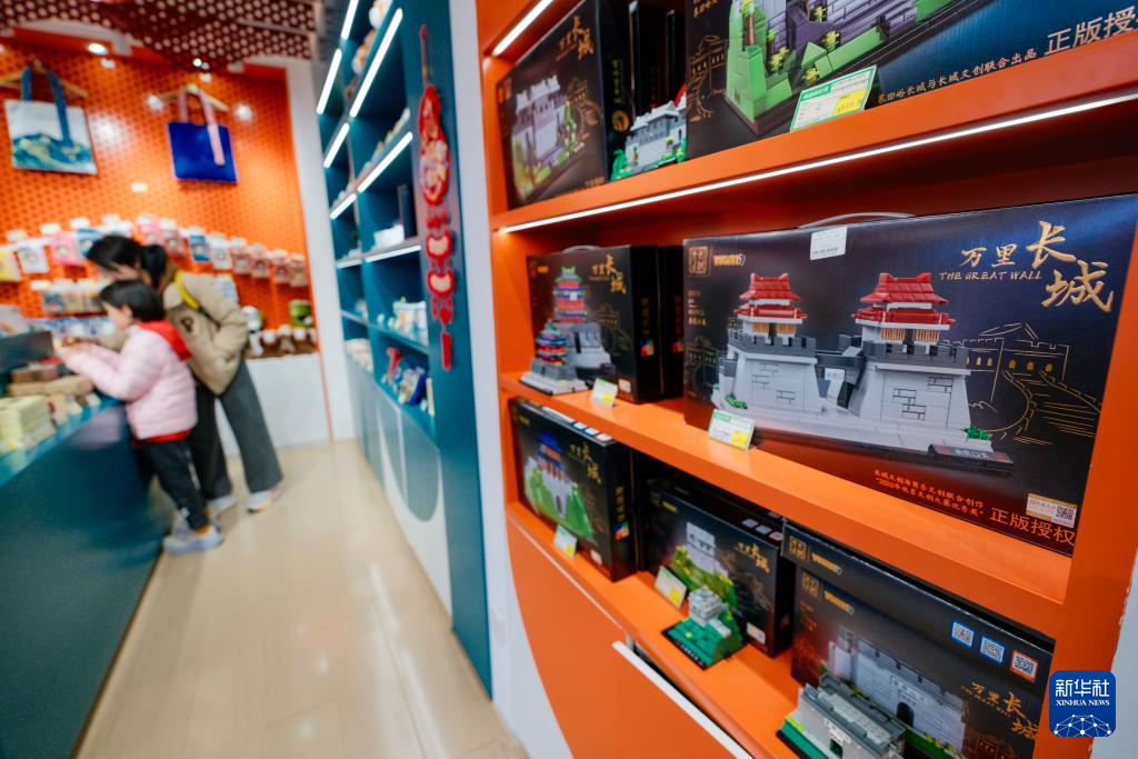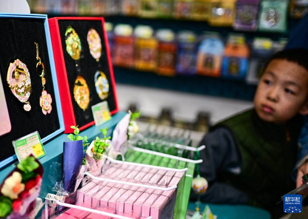 3月21日,在北京慕田峪长城景区的一家文创店内,一名小朋友打量售卖的文创产品。