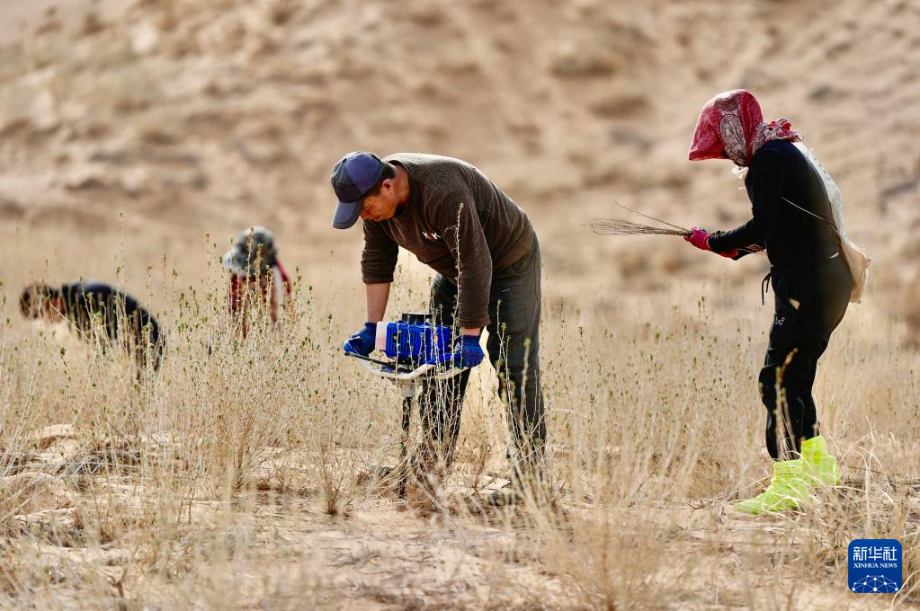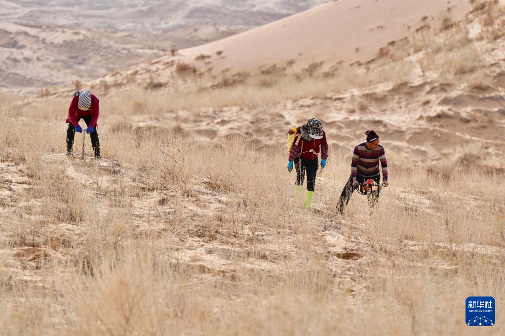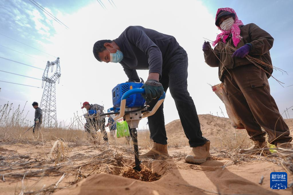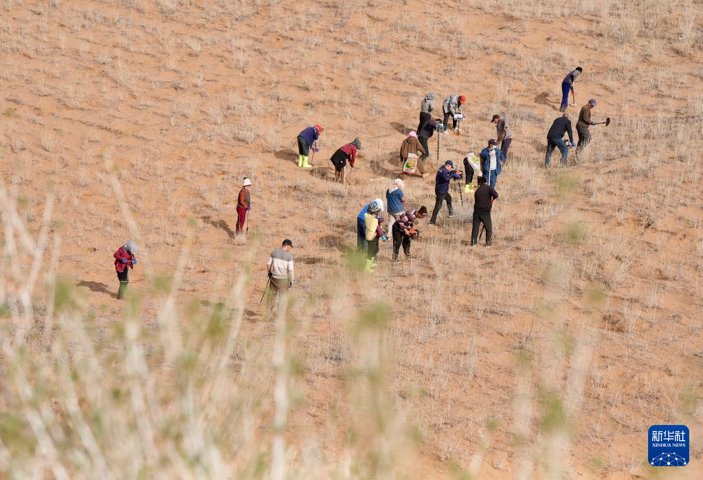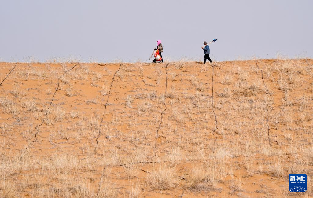 近日,随着天气转暖,宁夏中卫市组织治沙工人开展宁夏境内腾格里沙漠固沙锁边带补种补植工作,通过及时补种耐旱沙生植物,不断巩固治沙成果,筑牢黄河上游生态屏障。