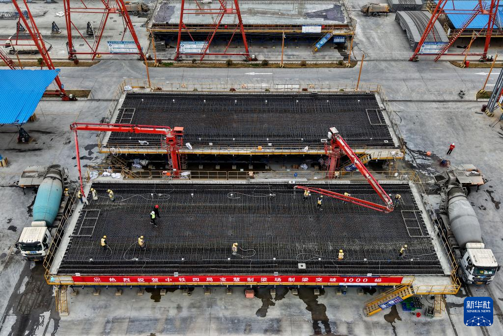 3月26日,工人在中铁四局宝慧制梁场1000榀箱梁浇筑施工现场进行混凝土浇筑作业。