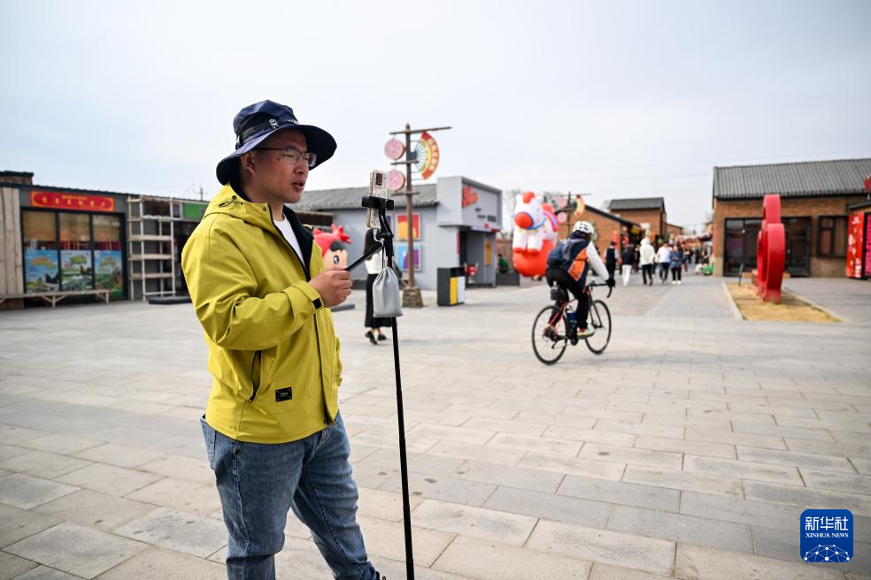 3月30日,工作人员在位于画匠营子村的“天下黄河第一村”景区直播,推介景区内的观光点。