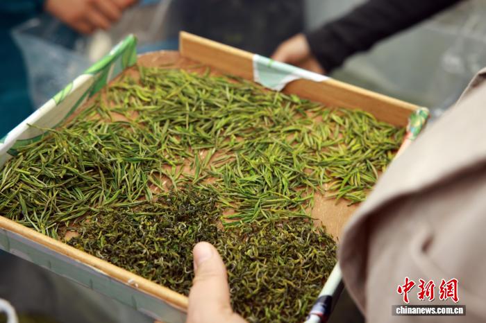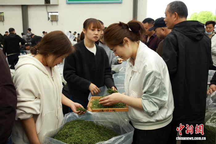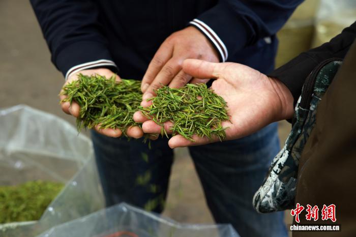 3月31日,茶商(右)在挑选新茶。中新社记者 孙杨洋 摄