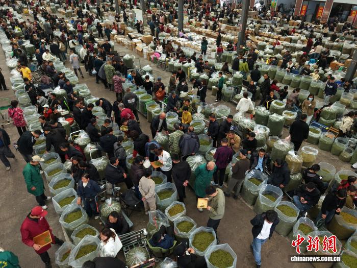3月31日,茶叶市场交易大厅内人头攒动。(无人机照片)中新社记者 孙杨洋 摄