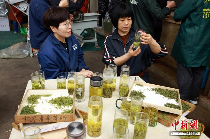 3月31日,茶商(右)查看新茶汤色。中新社记者 孙杨洋 摄