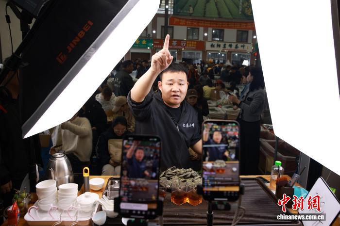 3月31日,创业青年亿茶小叶在网络直播销售茶叶。中新社记者 孙杨洋 摄