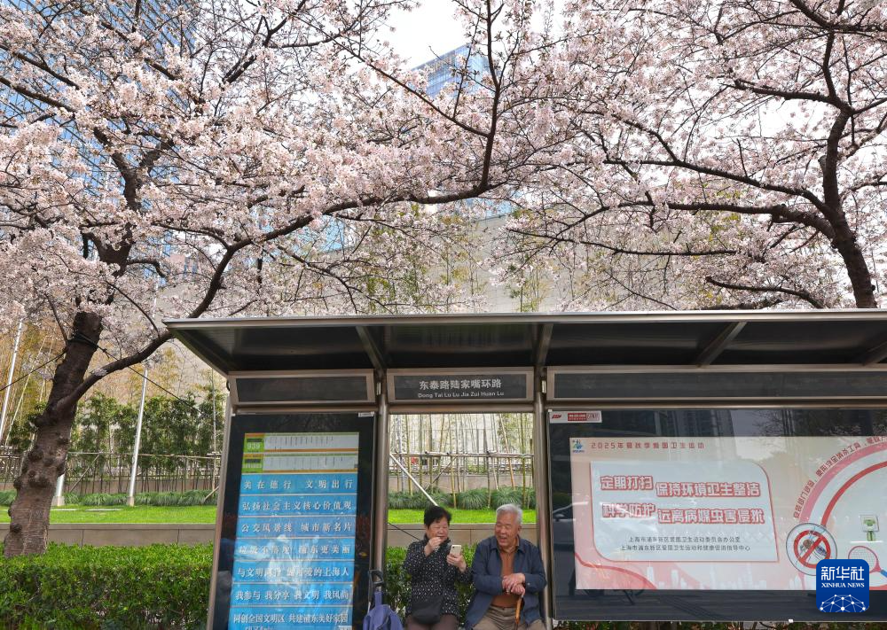 4月1日,在上海陆家嘴,市民在樱花树下的公交车站等车。