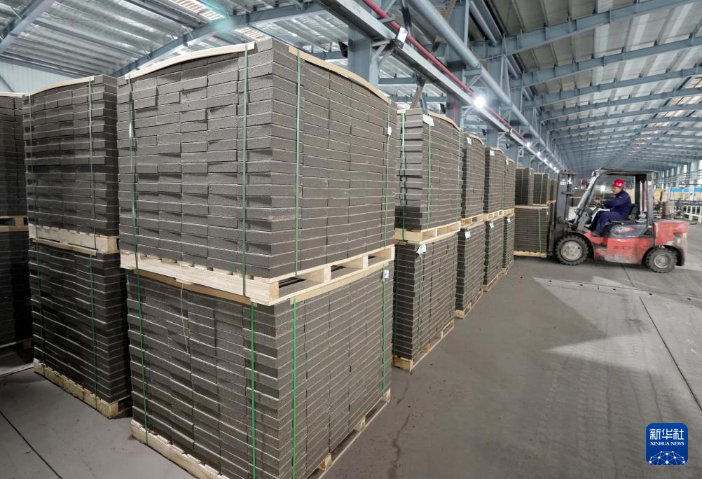 4月9日,工人在河北省迁安市一家以钢渣等固废为原料生产“钢砖”的企业生产车间工作。