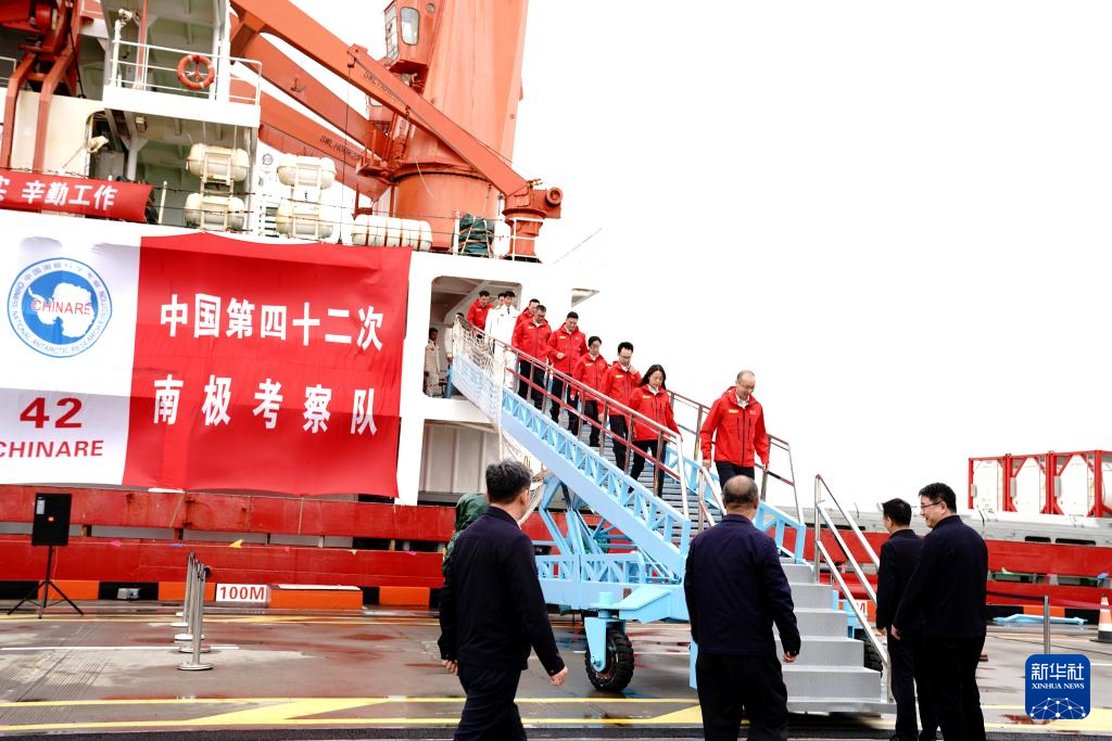 4月9日,中国第42次南极考察队队员走下“雪龙”号。