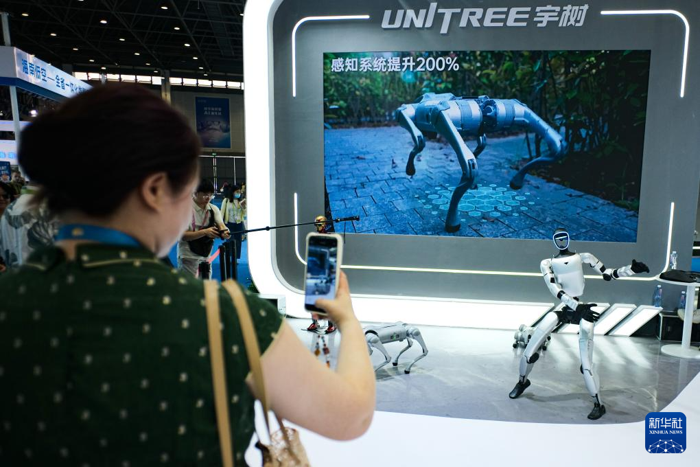 4月14日,观众在第六届消博会展厅内拍摄跳舞表演的宇树机器人。